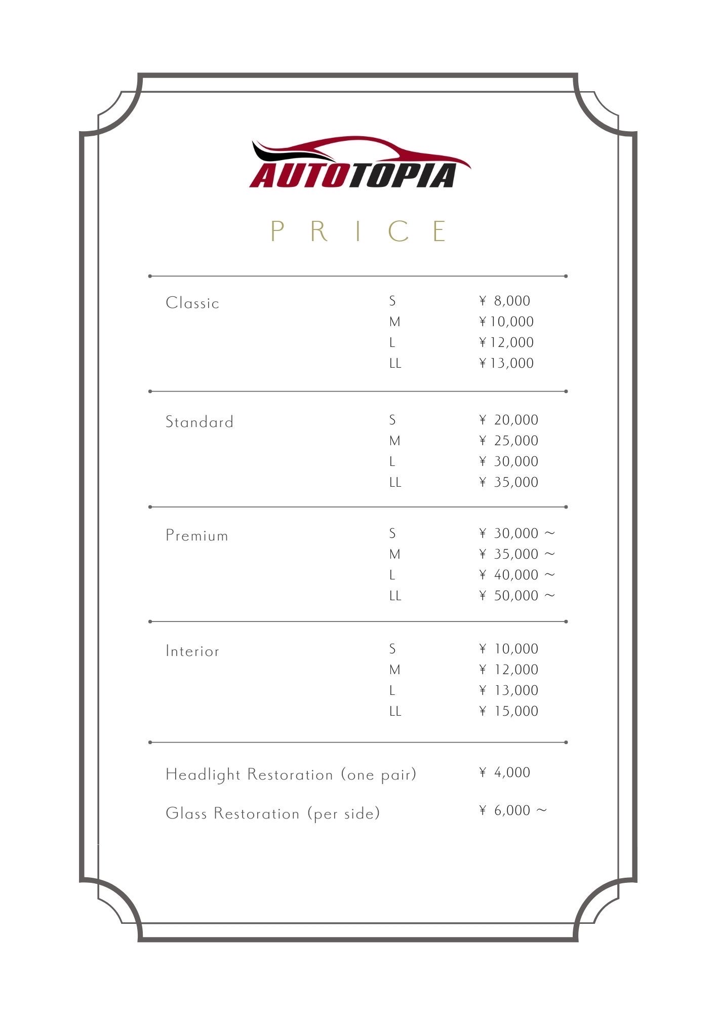 We have updated our list of our services and prices. The Services tab on Facebook has also been revised to match the prices below. Please use these pictures as a reference and use the service tab on Facebook to make a reservation. If you have any questions before making a reservation, please feel free to contact us at any time. Thank you for your interest in Autotopia.