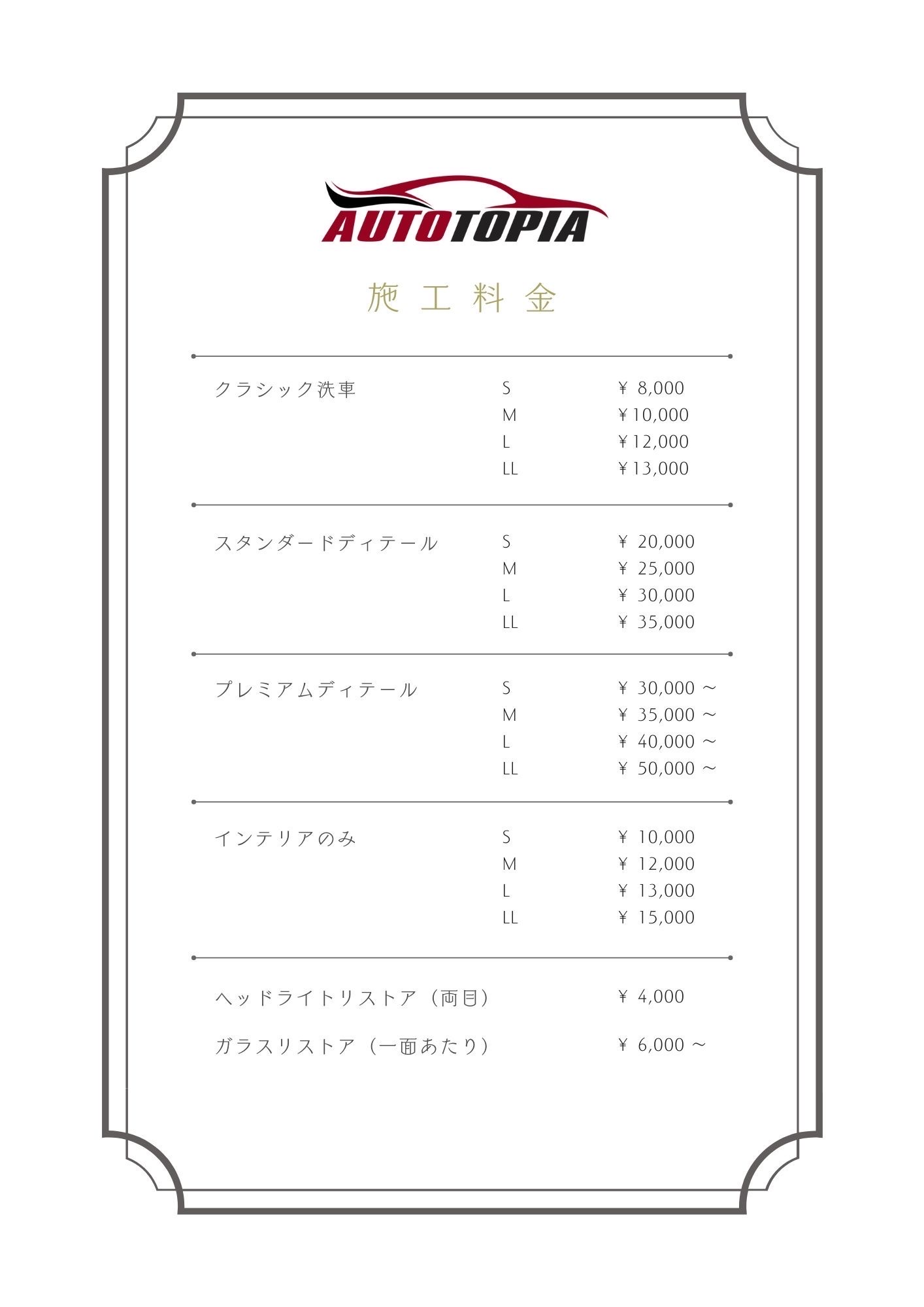 オートトピアのディテールメニューの詳細と料金表になります。